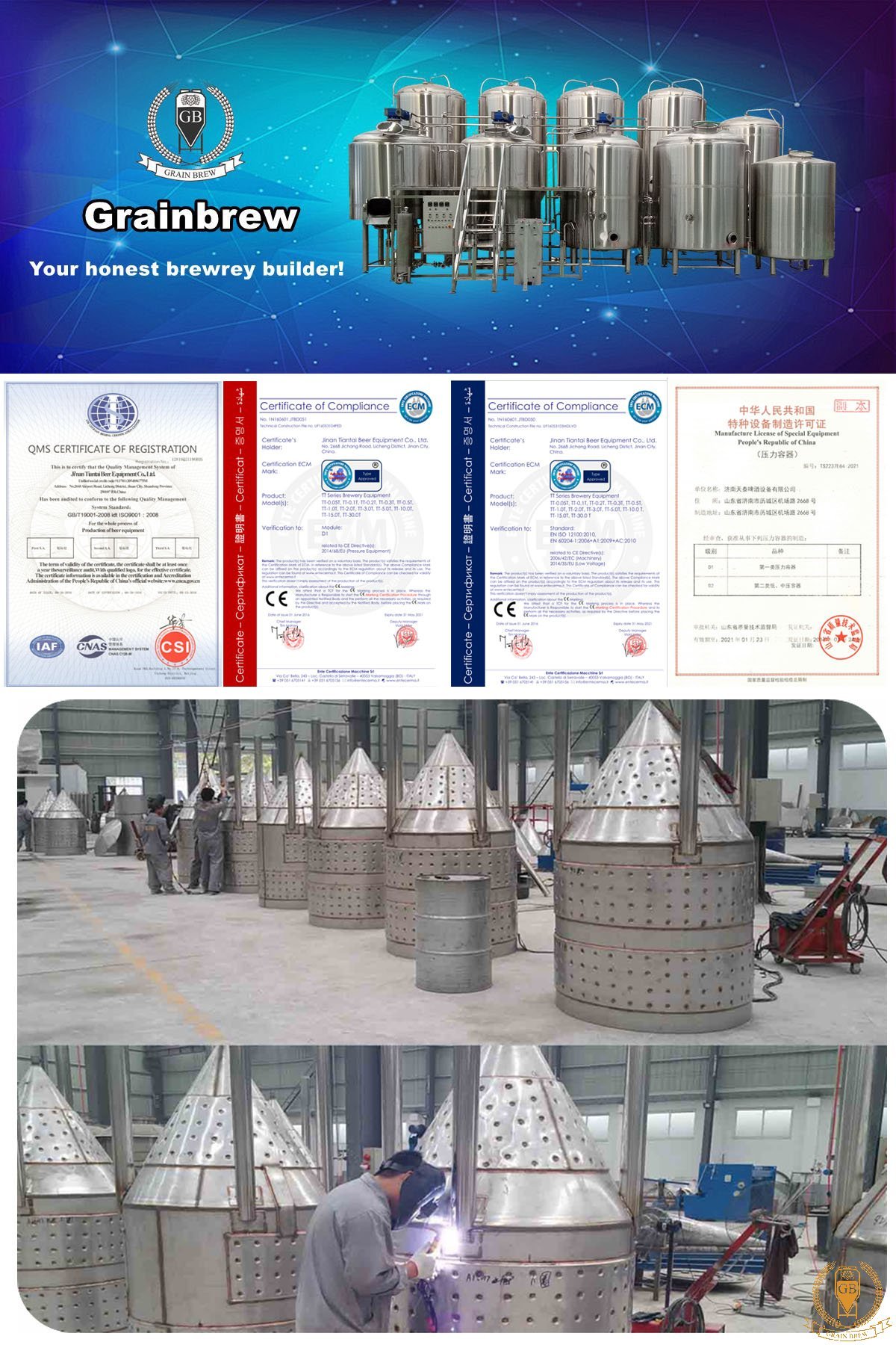 Shandong Grain Machinery Co., Ltd. (shortened as GrainBrew) is a China based manufacturer and supplier of brewery equipment with more than 10 years experiences. As an emerging and prospective competitor, we are more than a supplier to offer the brewery tanks connected by pipings and fittings, but a complete-solution provider to operate the turnkey brewing systems with custom designs for the craft brewers all over the world.