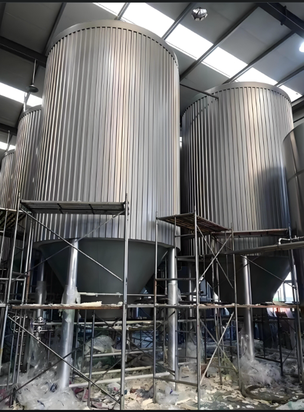 Fermentation is an extremely important process in beer production, in which yeast participates in complex biochemical reactions. Fermentation generally uses indoor or outdoor cylindrical cone-bottom fermenters, which are equipped with automatic cooling systems and can easily control the fermentation temperature. The cone-shaped tank bottom is convenient for yeast recovery. The CIP cleaning device can achieve all-round cleaning and sterilization without dead ends, ensuring the hygiene and safety of the production process. Fermentation tanks of different specifications and quantities are configured according to factors such as the fermentation cycle of different types of beer, the production proportion of different types of beer, and brewing batches.