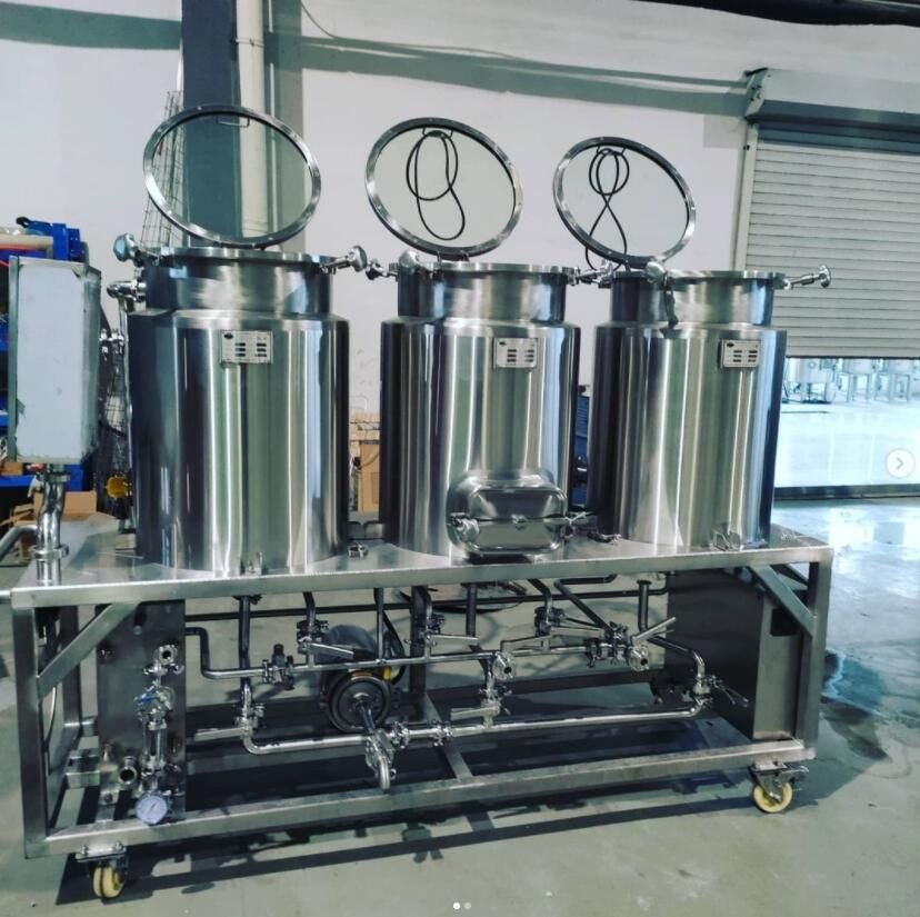And here are the fermenters put on the other trolley, the number of fermenters can be customized for your requirements, it could be one or two or three, four, usually depend on the types of beer you want to brew. Normally, three fermenters is commonly to be configured.