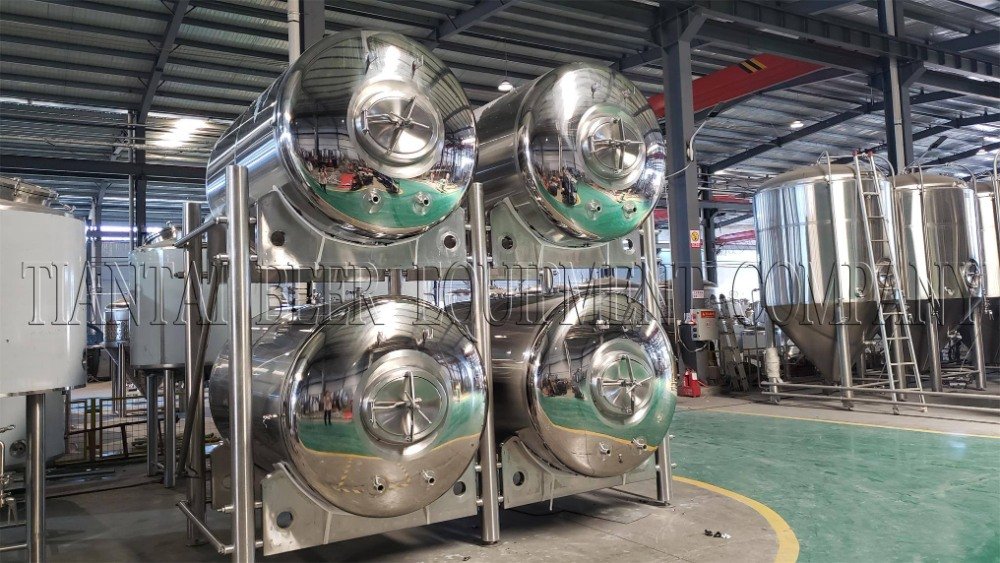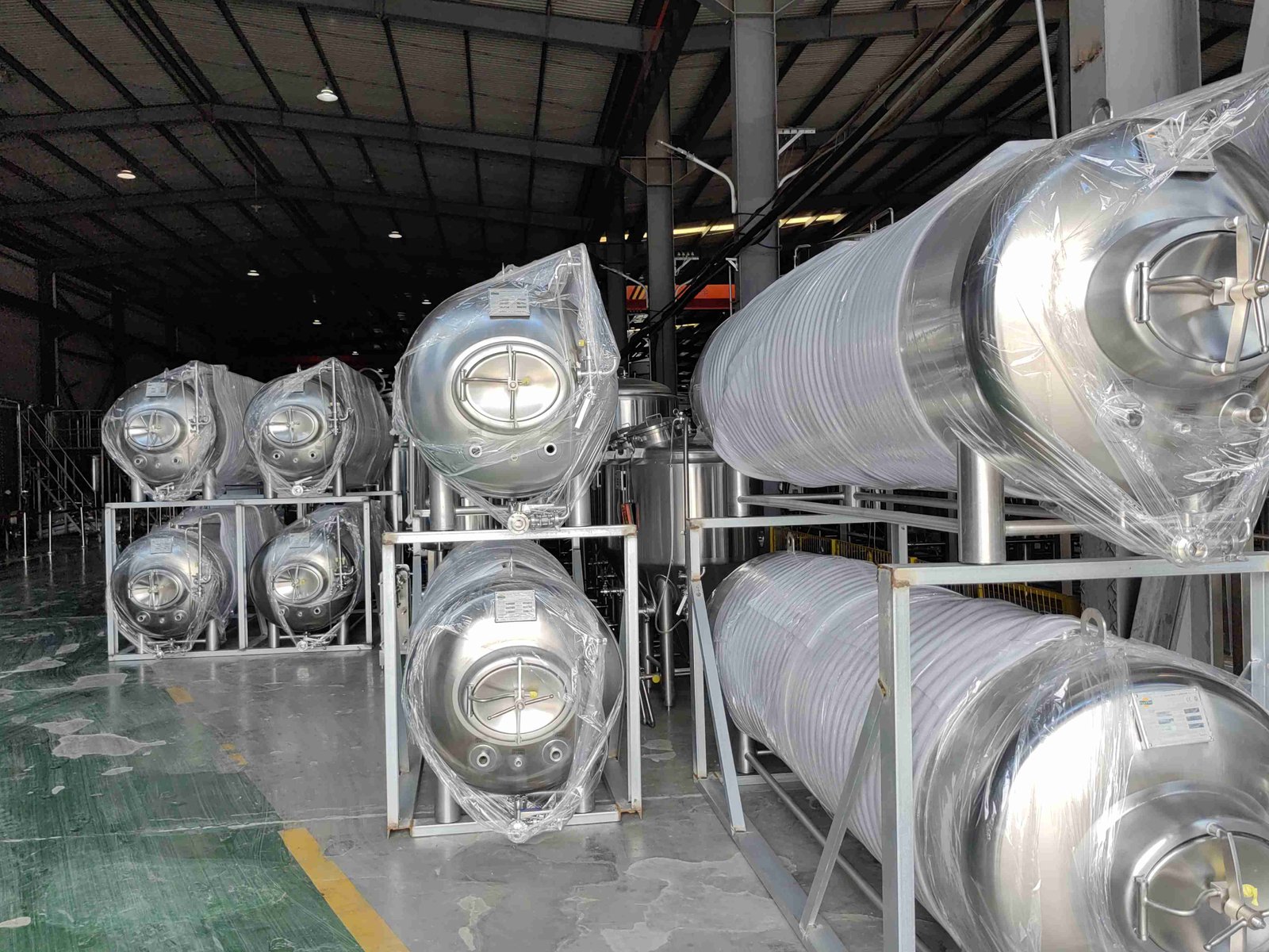 Horizontal serving tanks, also known as horizontal bright beer tanks or horizontal maturation tanks, are specialized vessels used in the beer industry to store, condition, and serve beer directly to the tap or packaging line. Unlike traditional vertical fermentation tanks, horizontal serving tanks are designed for the final stages of beer production, primarily for maturation and carbonation. The tanks in the photo are 10bbl stacked ones with frame that ready to be shipped to our customers.