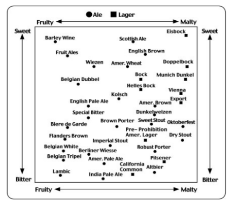 Figure- Relative Flavors of Beer Styles This chart is not to any scale but is a subjective attempt to describe how different beer styles taste relative to one another. As an over-simplification, a beer may be Malty-Sweet, Malty-bitter, Fruity-Sweet, or Fruity-Bitter. Each beer style was placed on the chart via a great deal of “arm waving”. The flavors often overlap between styles, and the variation within a single style can often bridge the positions of the styles next to it.