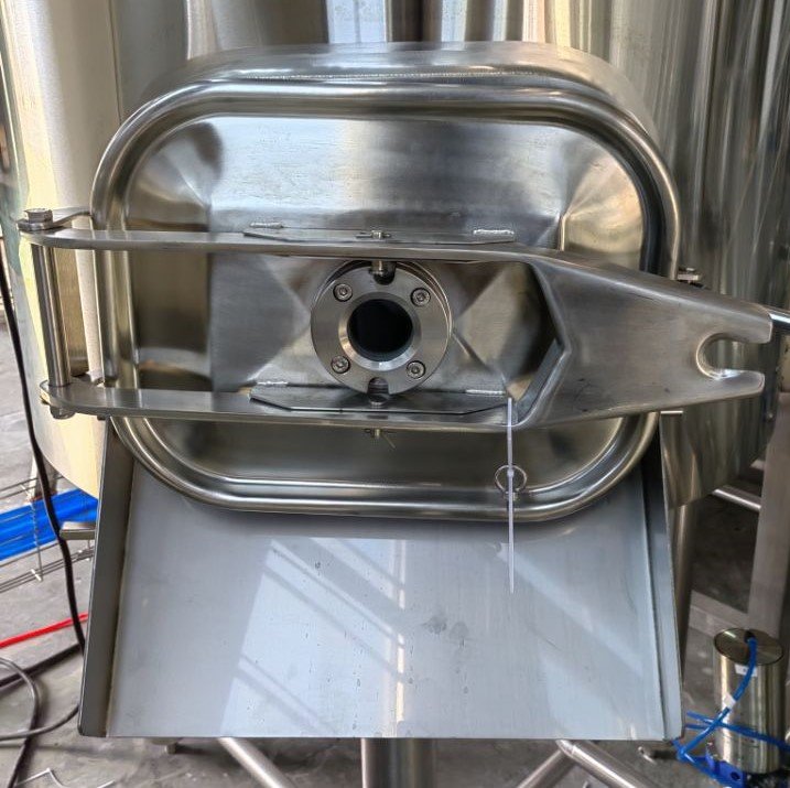 Below is a large side mounted spent grain door. It can be seen from the picture with a small glass sight glass for easy observation. And the outlet guide plate is detachable.